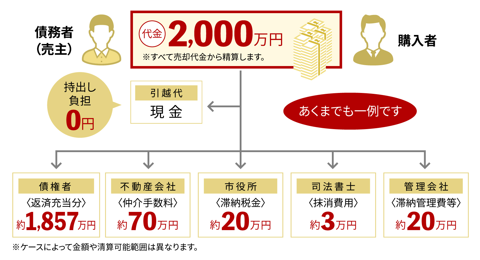 売主として持ち出し負担の費用は一切無く、債権者との調整次第で、売却代金の中から一部を引越代金や住替え資金(現金)として配分できる。又、税金、管理費・修繕積立金(マンションの場合)等の滞納金も精算可能なケースもある。 諸費用 基本的に立退料や引越代の請求はできない。立退き日等においてトラブル発生も。(落札者は裁判所に引渡命令・強制執行の申立が行えるため)